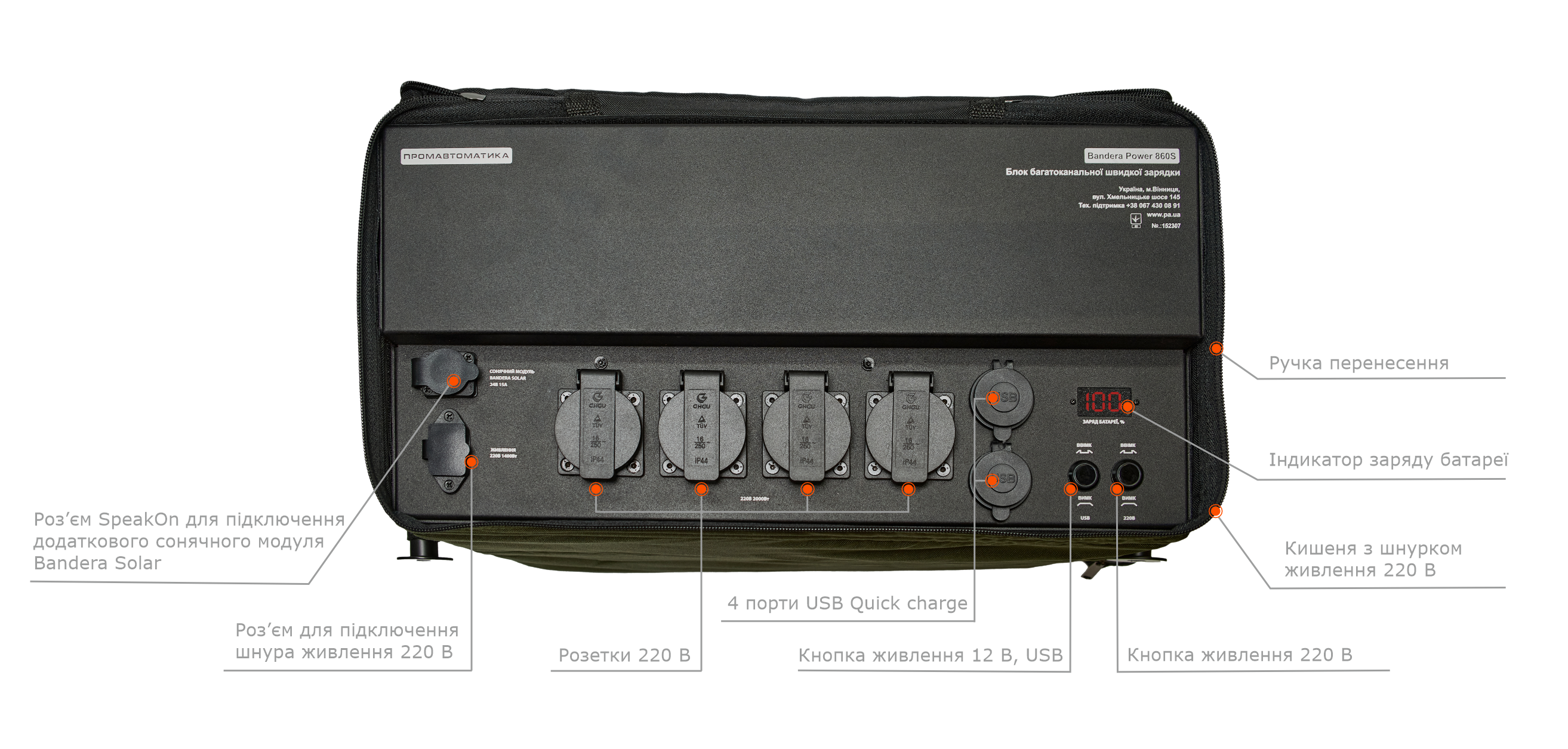Bandera Power це портативний, універсальний зарядний пристрій, для забезпечення критично важливого живлення військових гаджетів. Завдяки широкому функціоналу та великій кількості роз'ємів, зарядна станція Bandera Power забезпечить живленням: