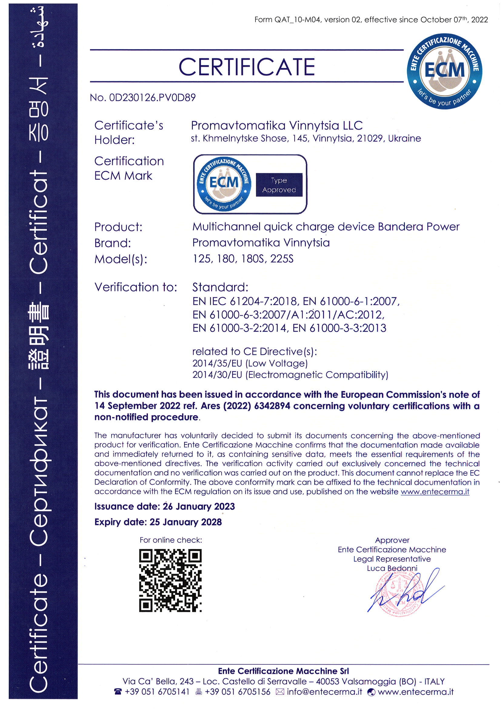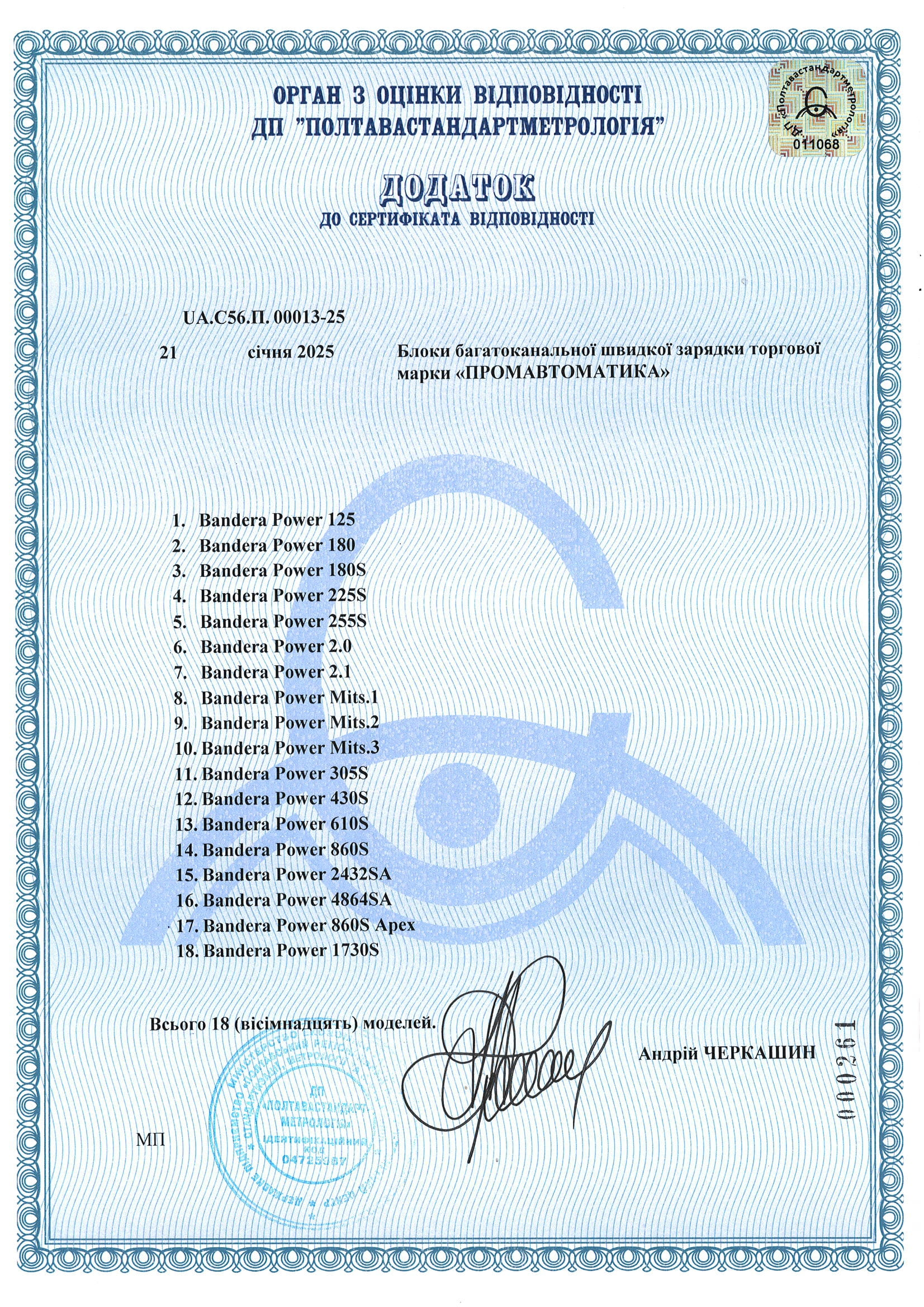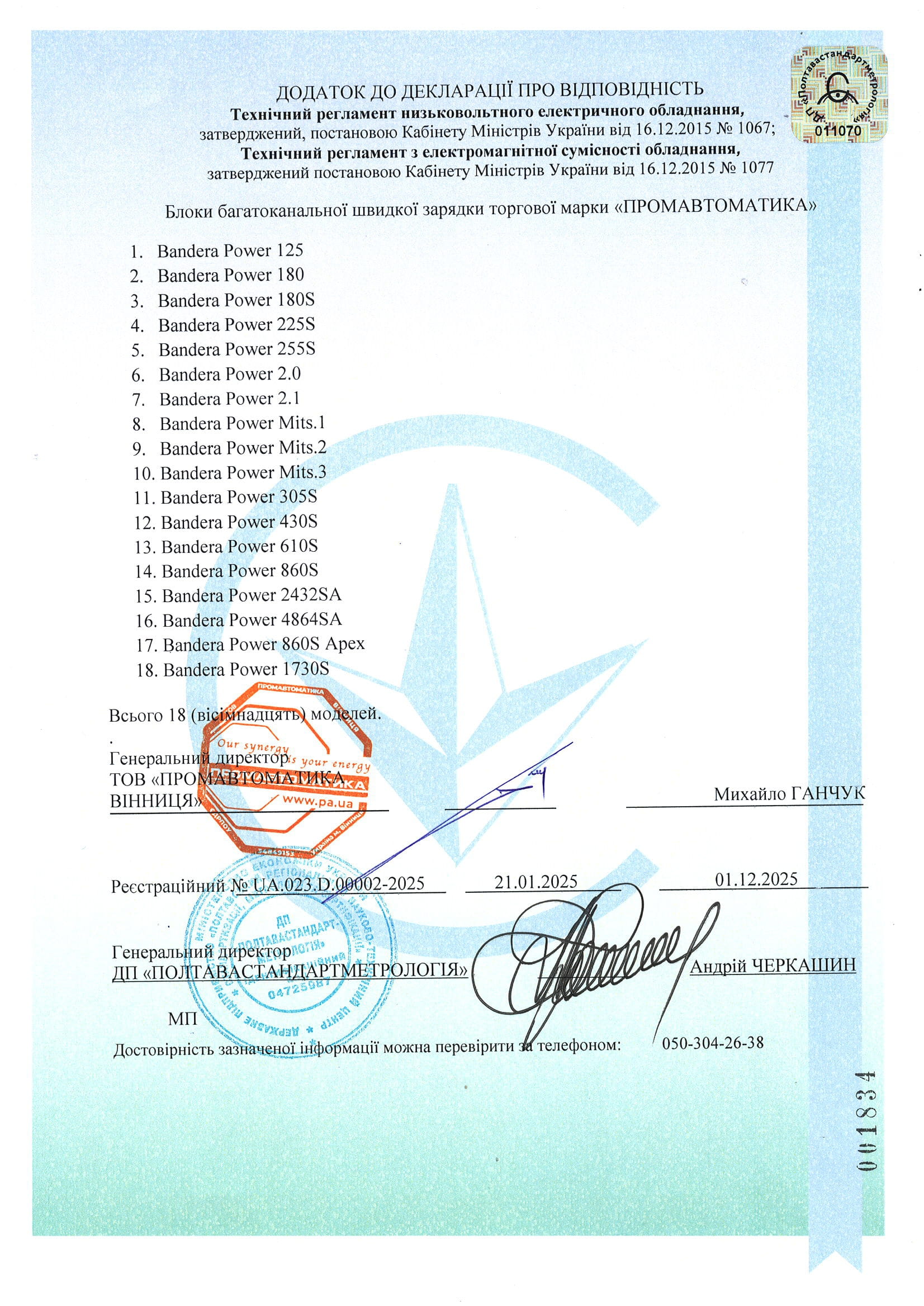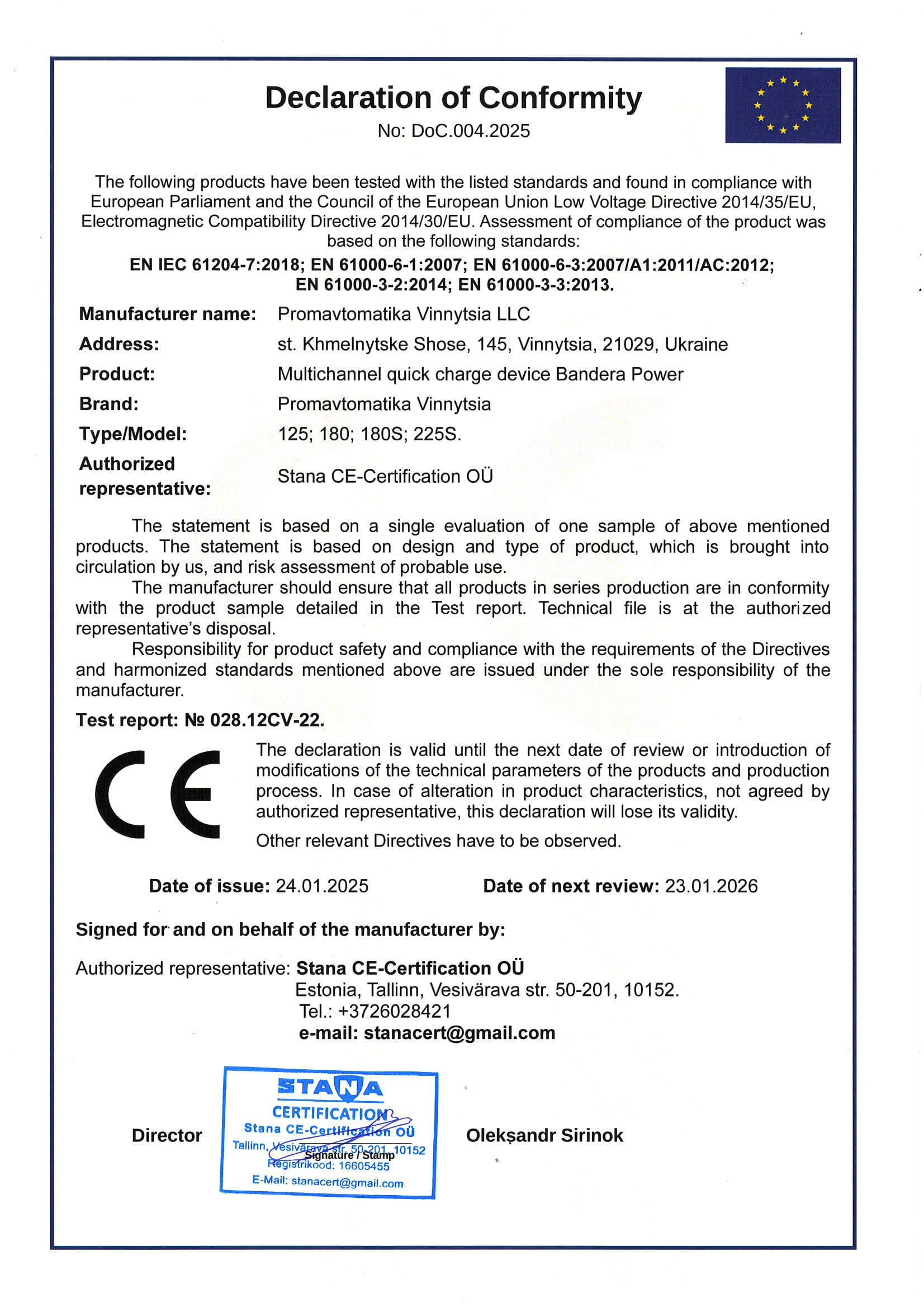 Для забезпечення високої якості продукції Bandera Power, проводиться процедура контролю якості на кожному етапі виробництва. Компоненти та матеріали, що використовуються для виготовлення Bandera Power, проходять ретельний контроль і перевірку на відповідність стандартам.